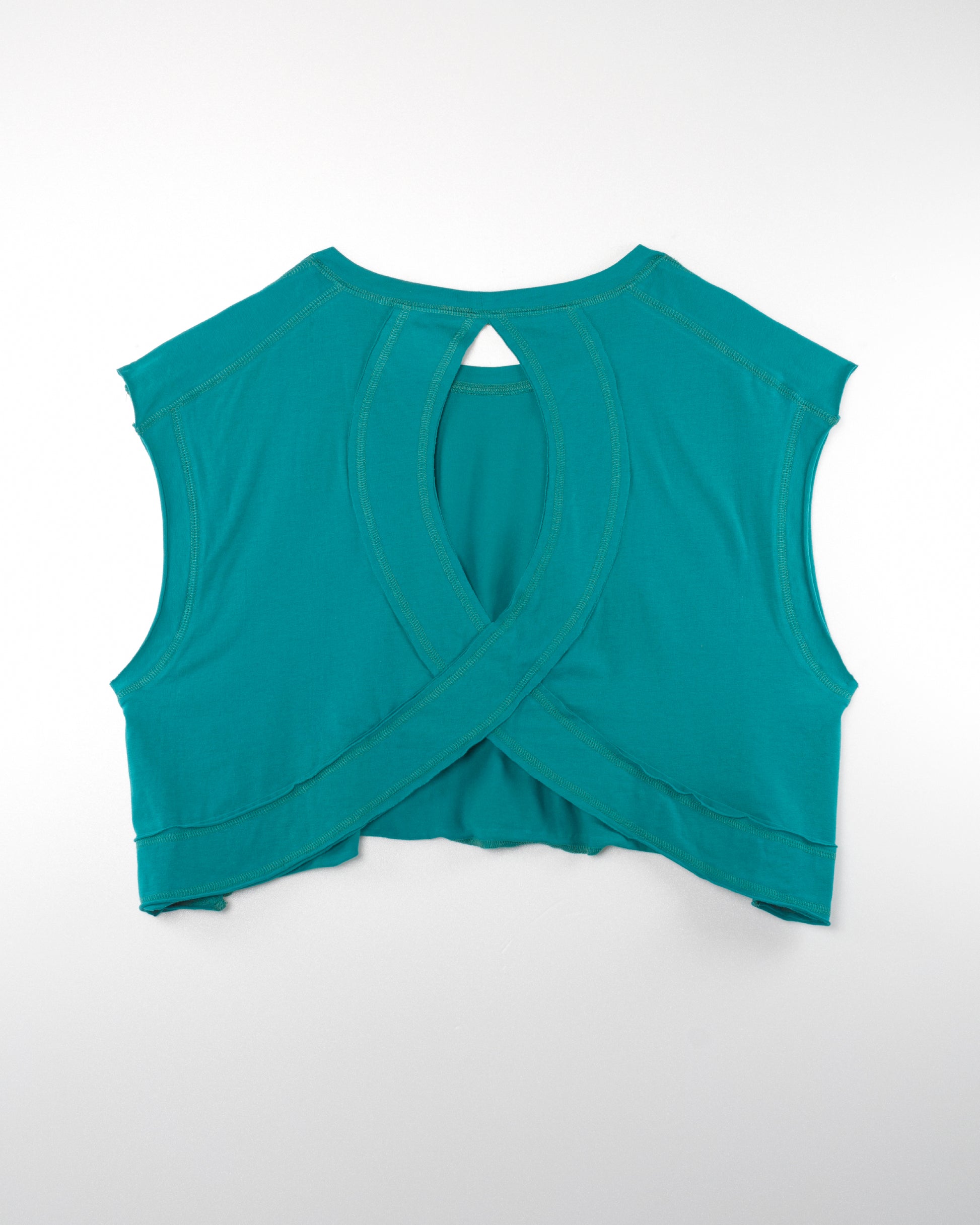 背中のデザインが特徴的なクロップドTシャツ、チラリと見せるブラトップとのレイヤードがおしゃれにきまります。