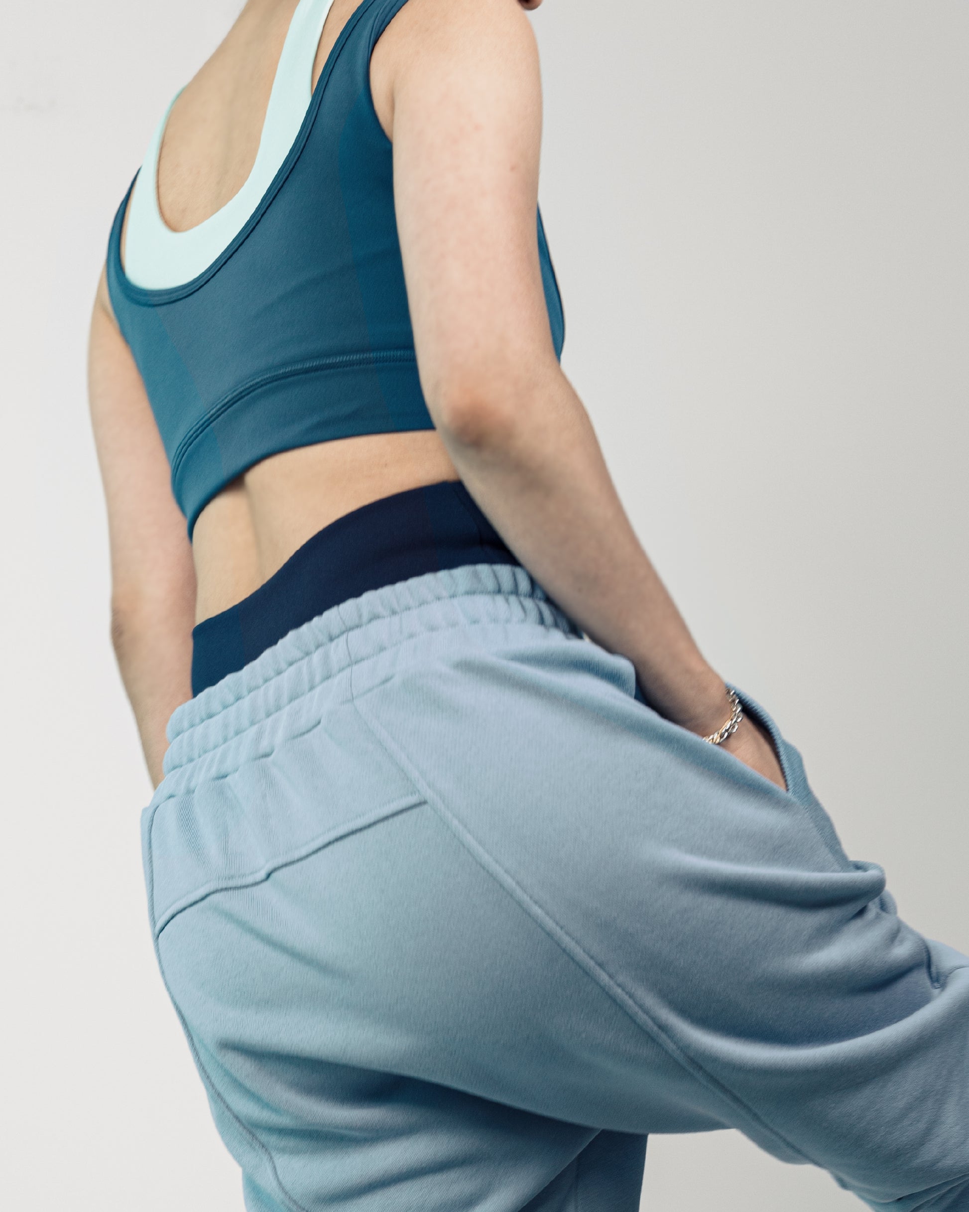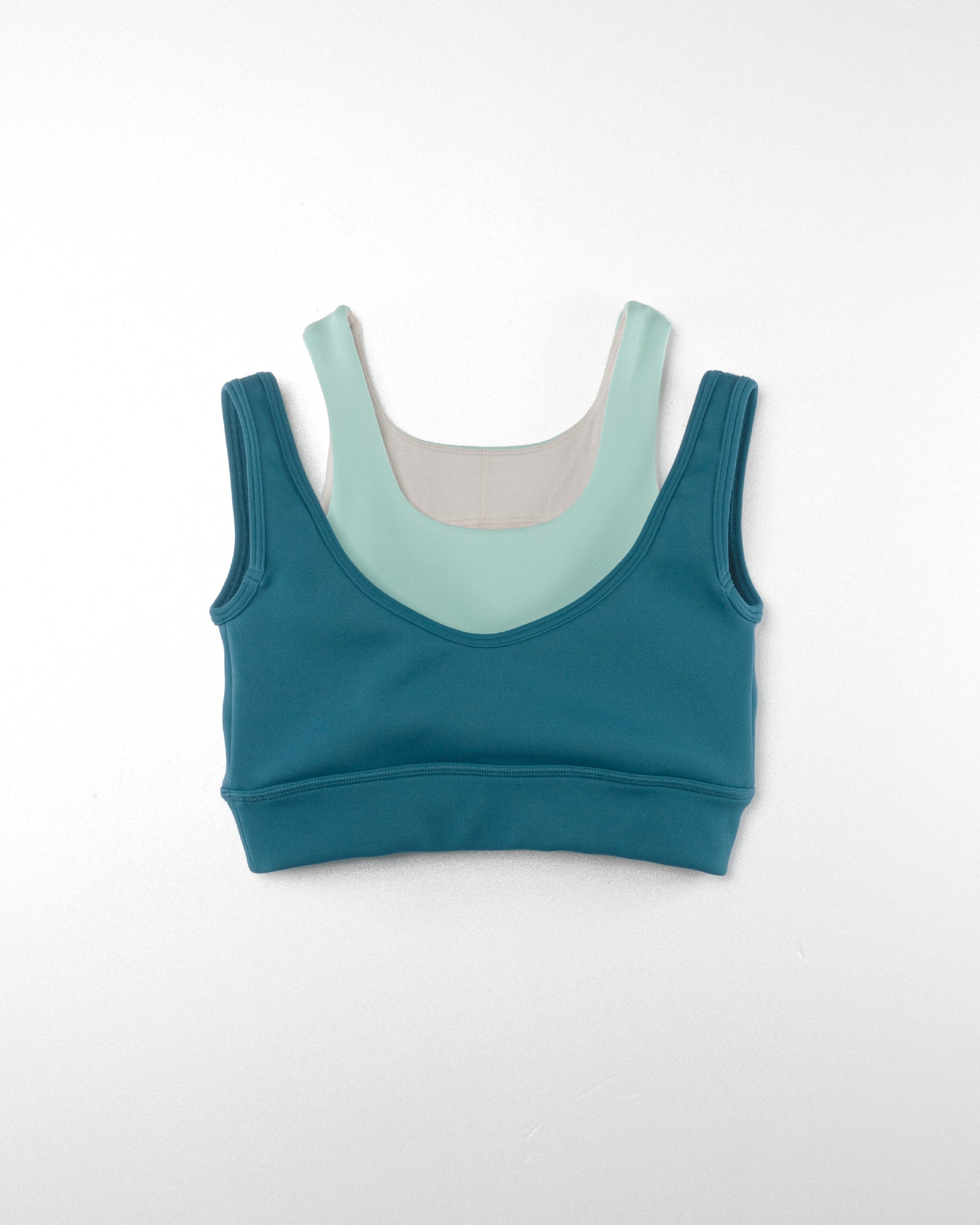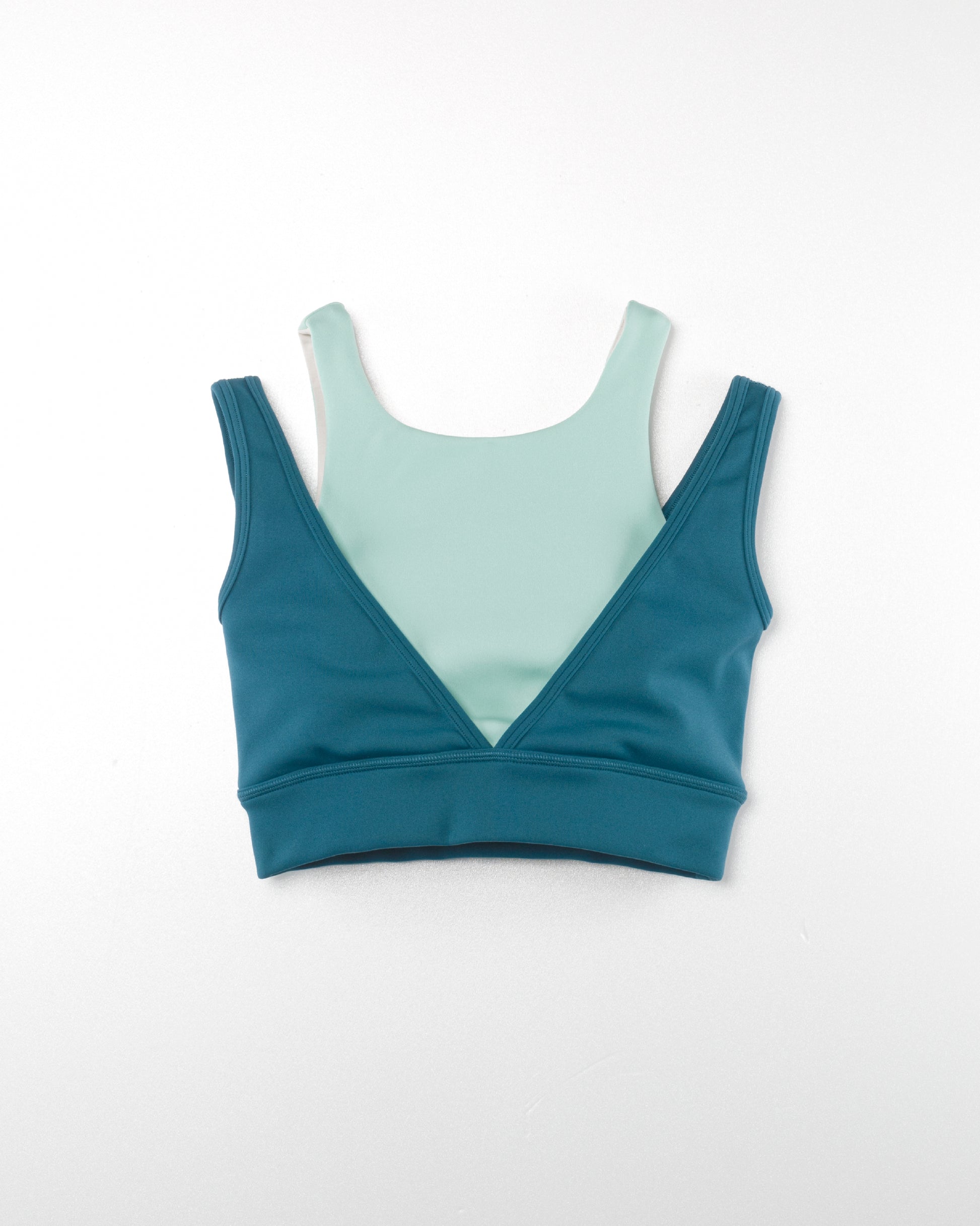 クルーネックとVネックをレイヤードさせたユニークなデザインのスポーツブラ、長めの着丈でブラトップとしての着こなしもおしゃれにきまります。エメラルドグリーンとミントの上級者なカラーコンビです。
